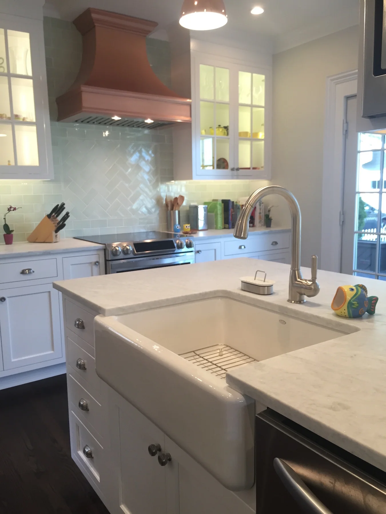 The cold tile floor was replaced with new custom-stained white oak floors, the exterior walls were reinstalled, and the newly installed sheetrock received several coats of durable Benjamin Moore paints. The custom inset cabinets by Plain & Fancy Montclair both took full advantage of every inch of space the kitchen had to offer and, thanks to their built-in LED lighting, provide crisp illumination of the beautiful porcelain backsplash and custom-honed quartzite countertops from Dente Trading. Finishing touches include plumbing Kohler and Moen plumbing fixtures from General Plumbing Supply, an Andersen patio door and wood molding from West Essex Building Supply, sleek induction range from Samsung and an unforgettable custom-fabricated copper hood.